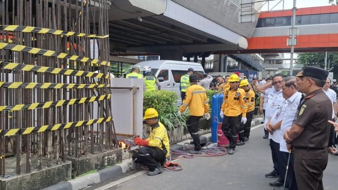 saranarakyat.com: Gubernur DKI Jakarta Pramono Anung didampingi mantan Gubernur DKI Jakarta Sutiyoso Bang Yos), meninjau dan menyaksikan pemotongan tiang monorel yang sudah lama mangkrak di Jalan HR Rasuna Said, Jakarta Selatan.
